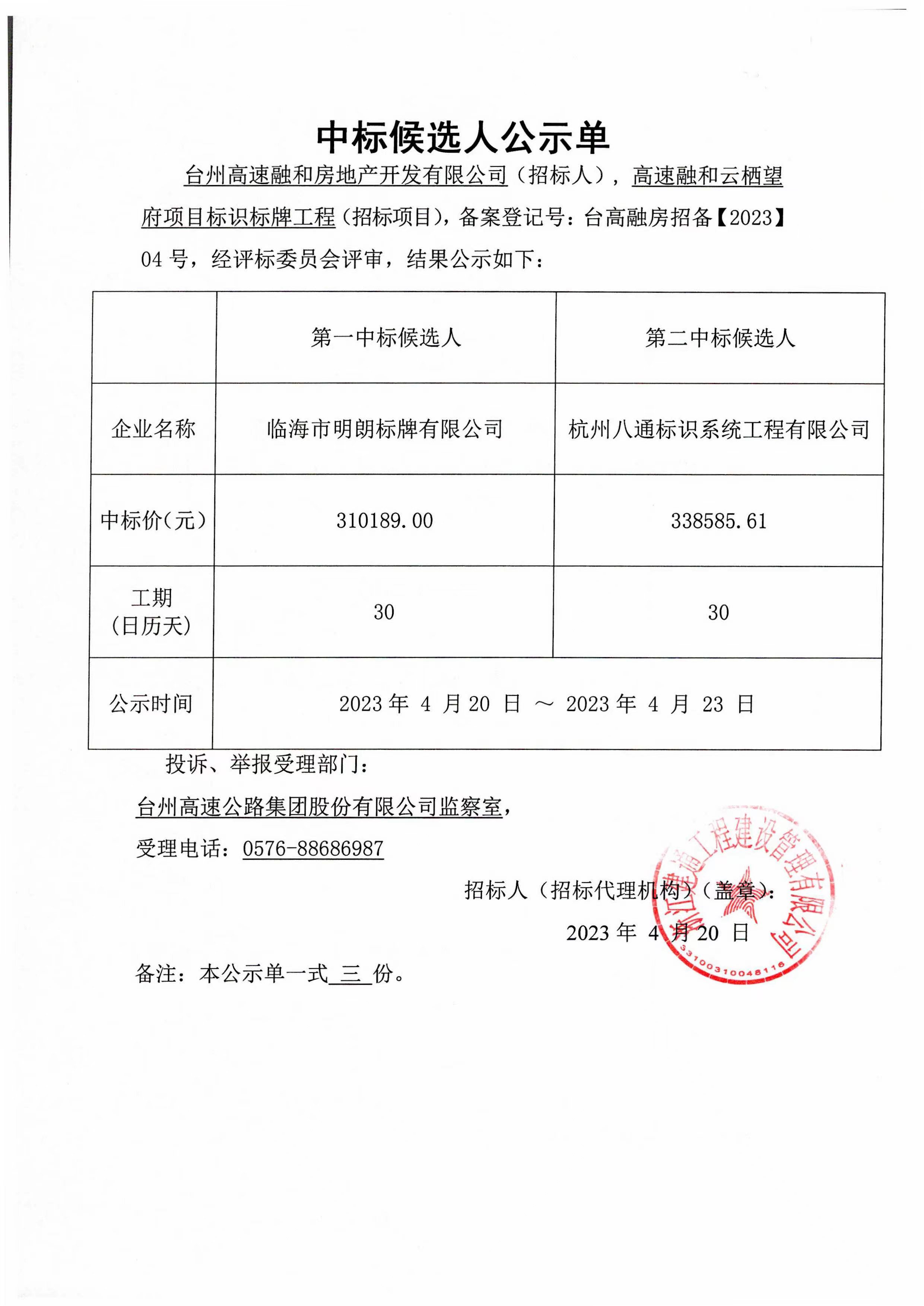 高速融和云棲望府項(xiàng)目標(biāo)識(shí)標(biāo)牌工程中標(biāo)候選人公示單