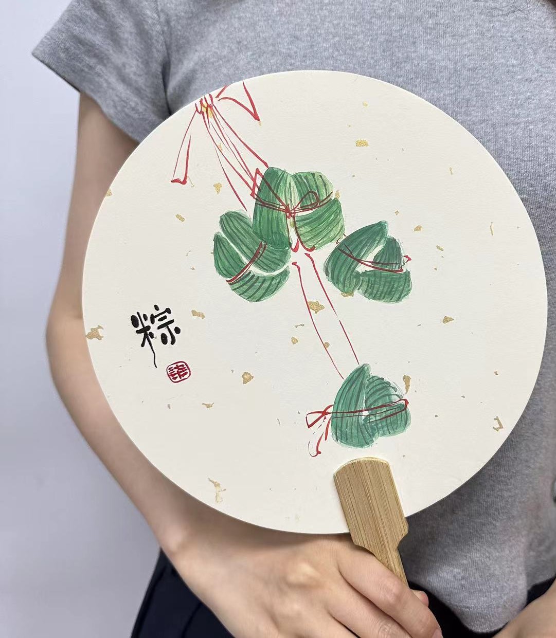 在活動(dòng)中,授課老師向大家講解了團(tuán)扇的繪制技巧后,大家紛紛拿起畫筆,充分發(fā)揮各自想象力,嘗試?yán)L制團(tuán)扇,并細(xì)心構(gòu)圖、上色。在授課老師的細(xì)心指導(dǎo)和大家的耐心繪畫下,沒(méi)多久,一把把樣式精美的香粽扇面展現(xiàn)在大家面前。